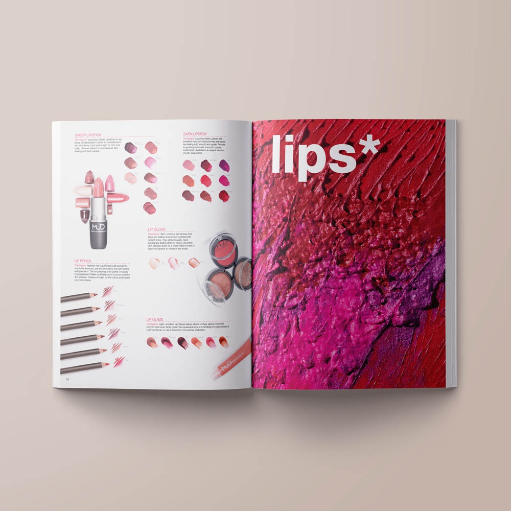 I photographed all categories of MUD products for catalog and magazine. I adjusted the size and spacing of the products to include descriptions and color swatches. I also spent a lot of time retouching to make sure the products look flawless and have uniform coloring.