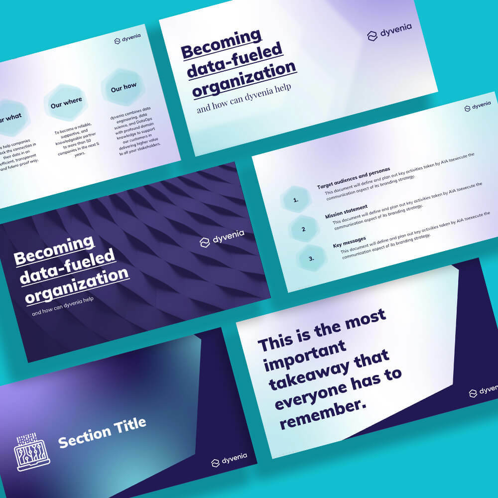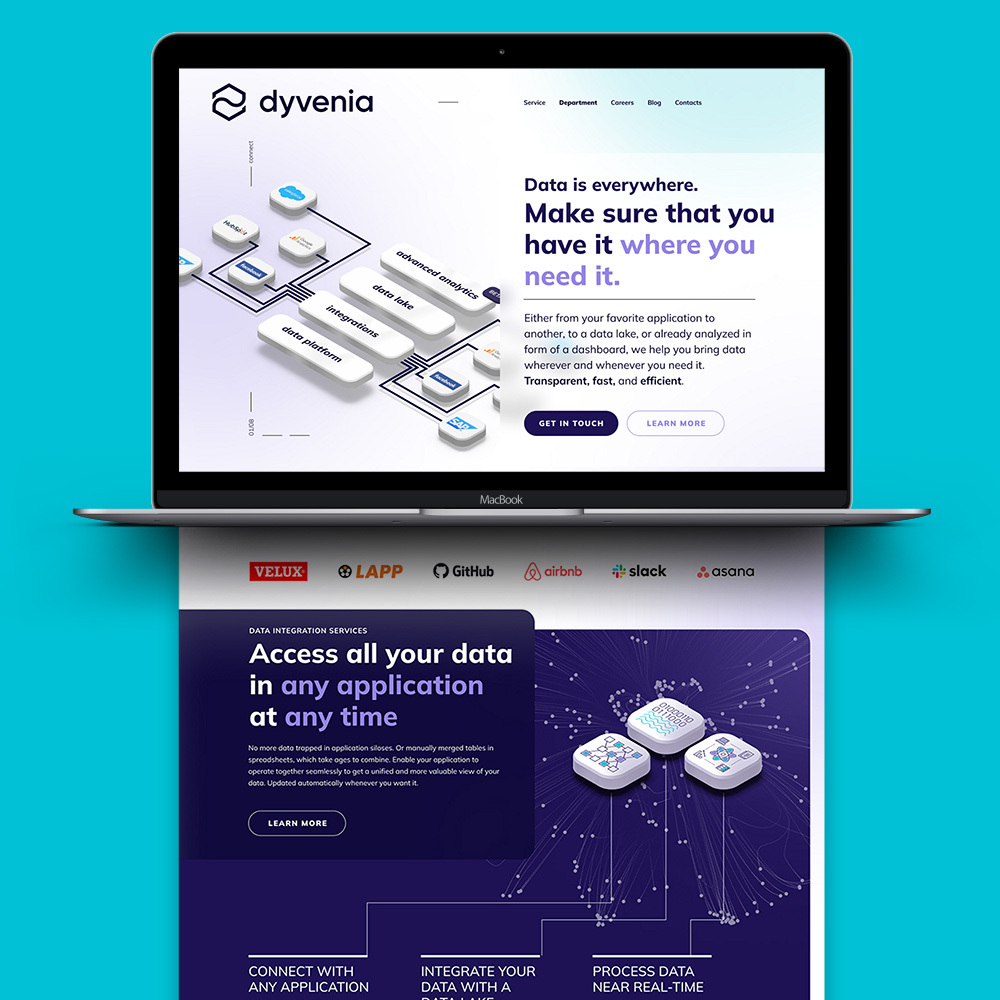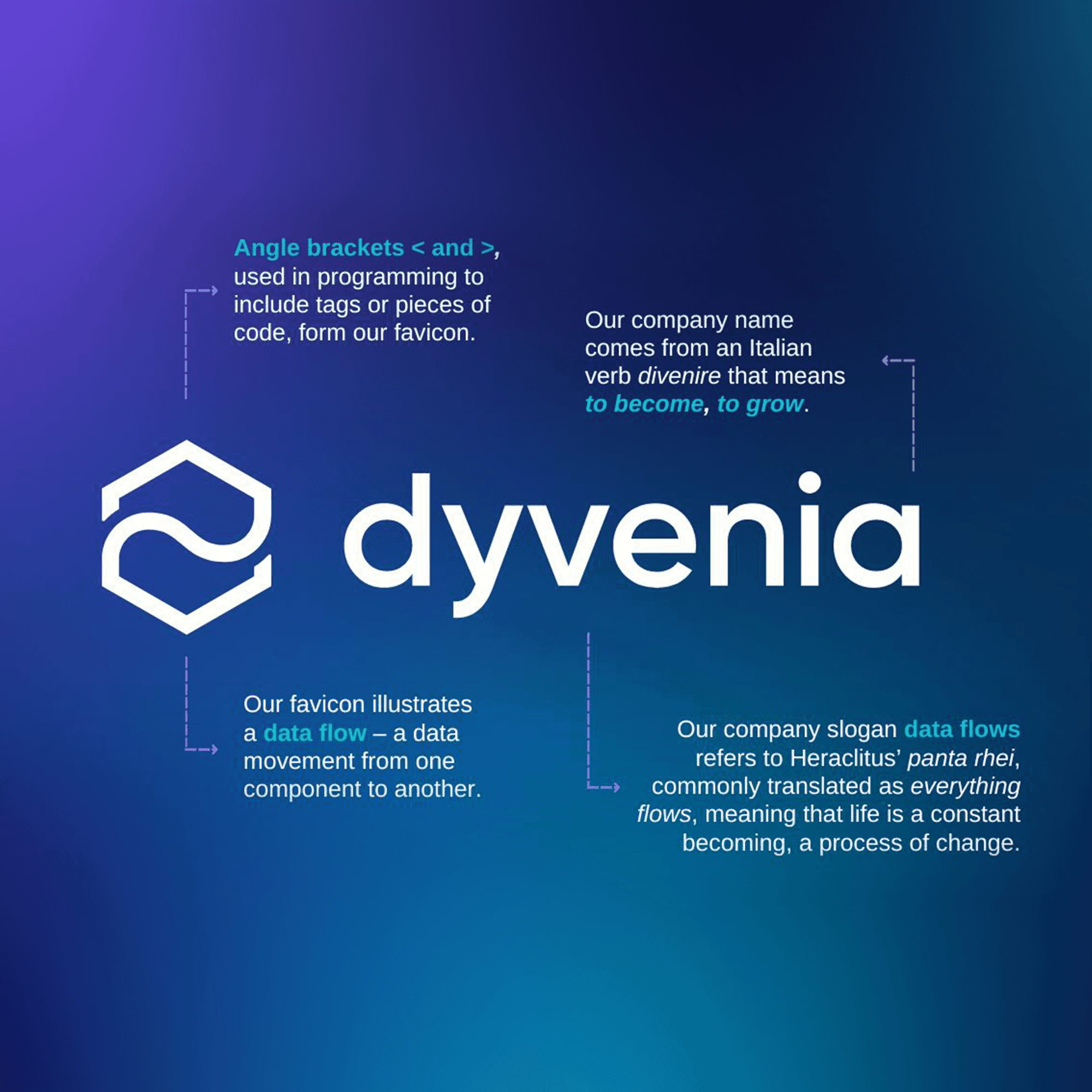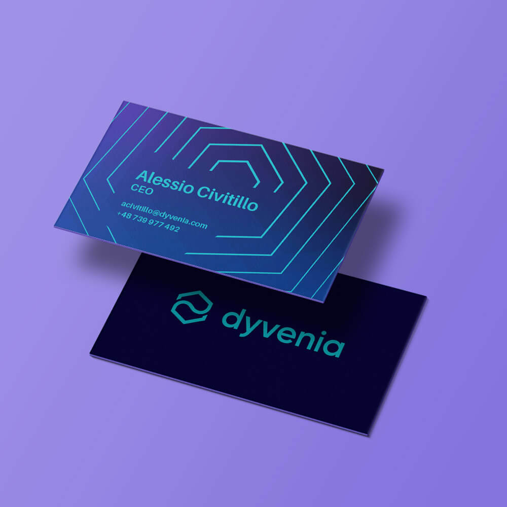 I designed a comprehensive visual identity for a tech company dyvenia. The logotype is a redesign of their first version where I aligned curves in sounder order and changed the typography for a bolder choice that communicates strength and power.
