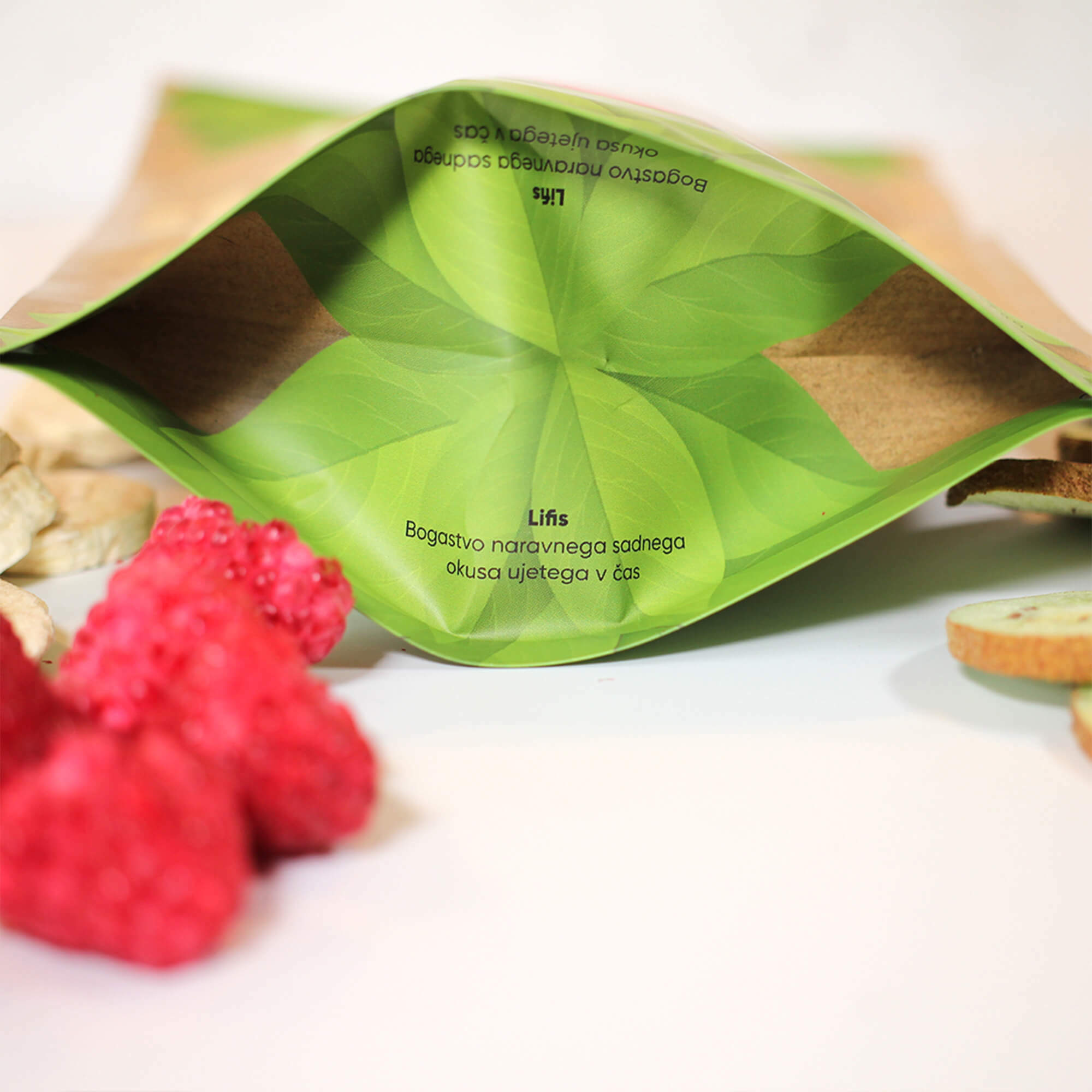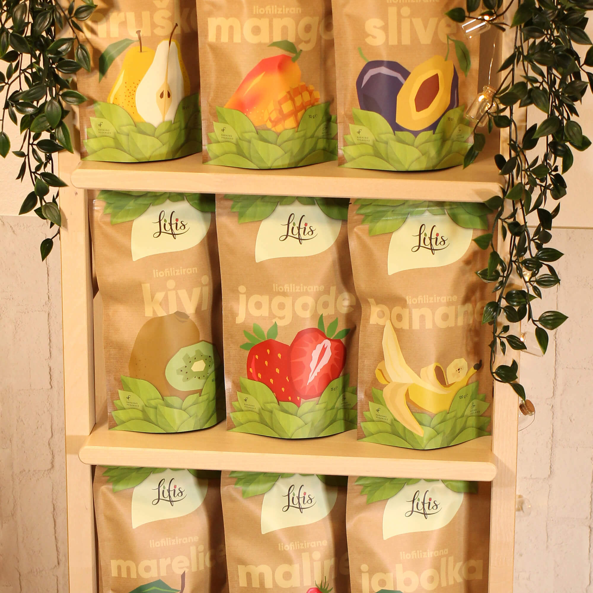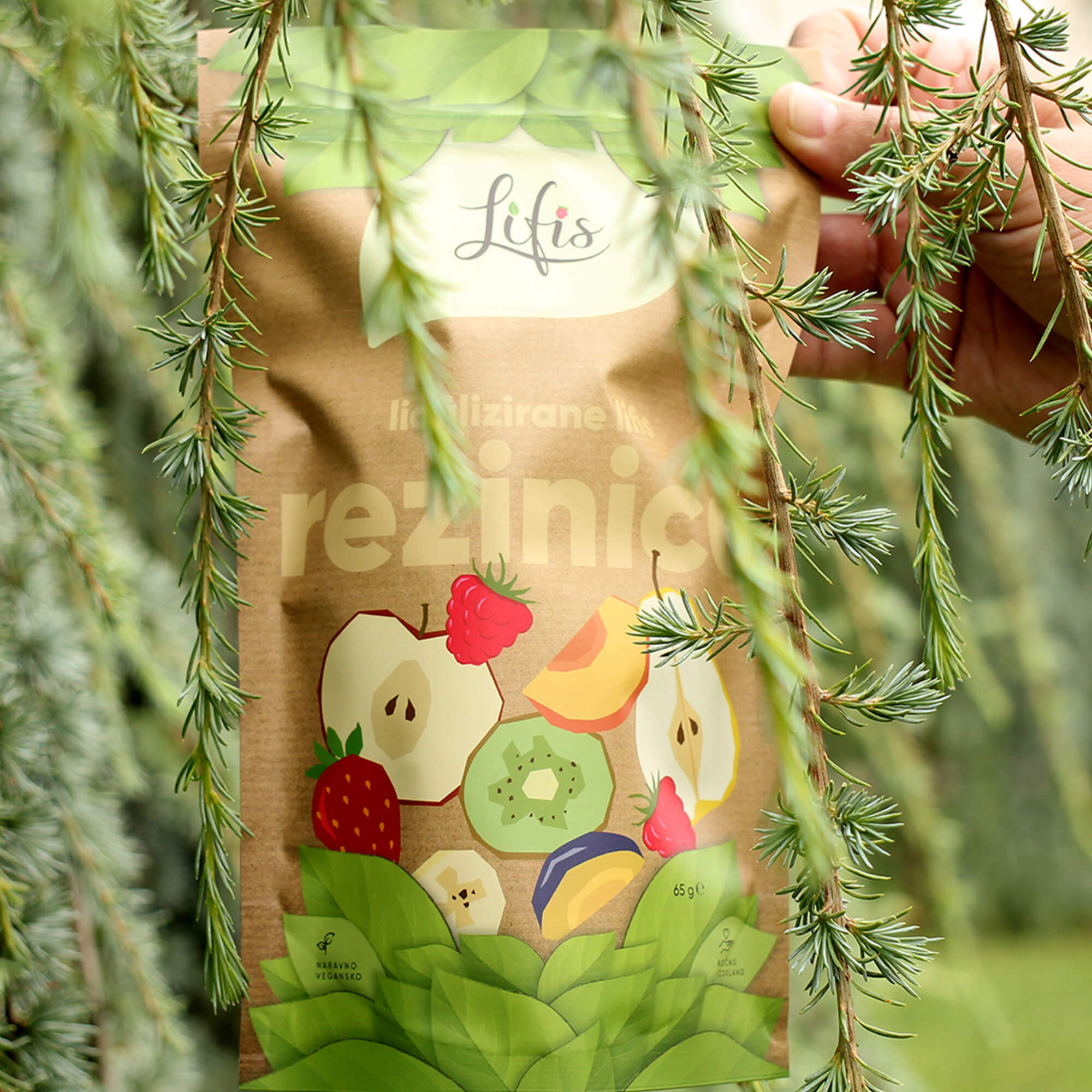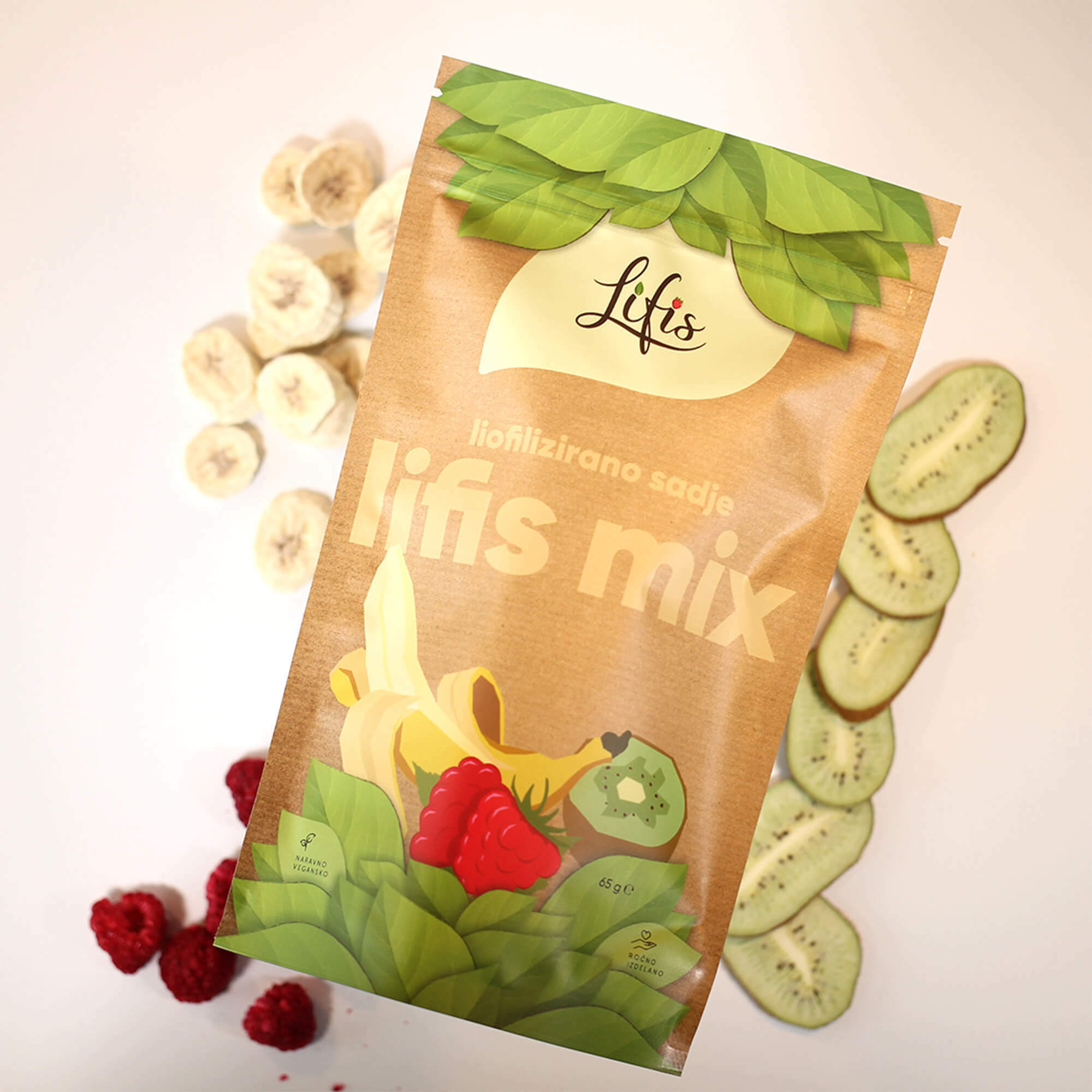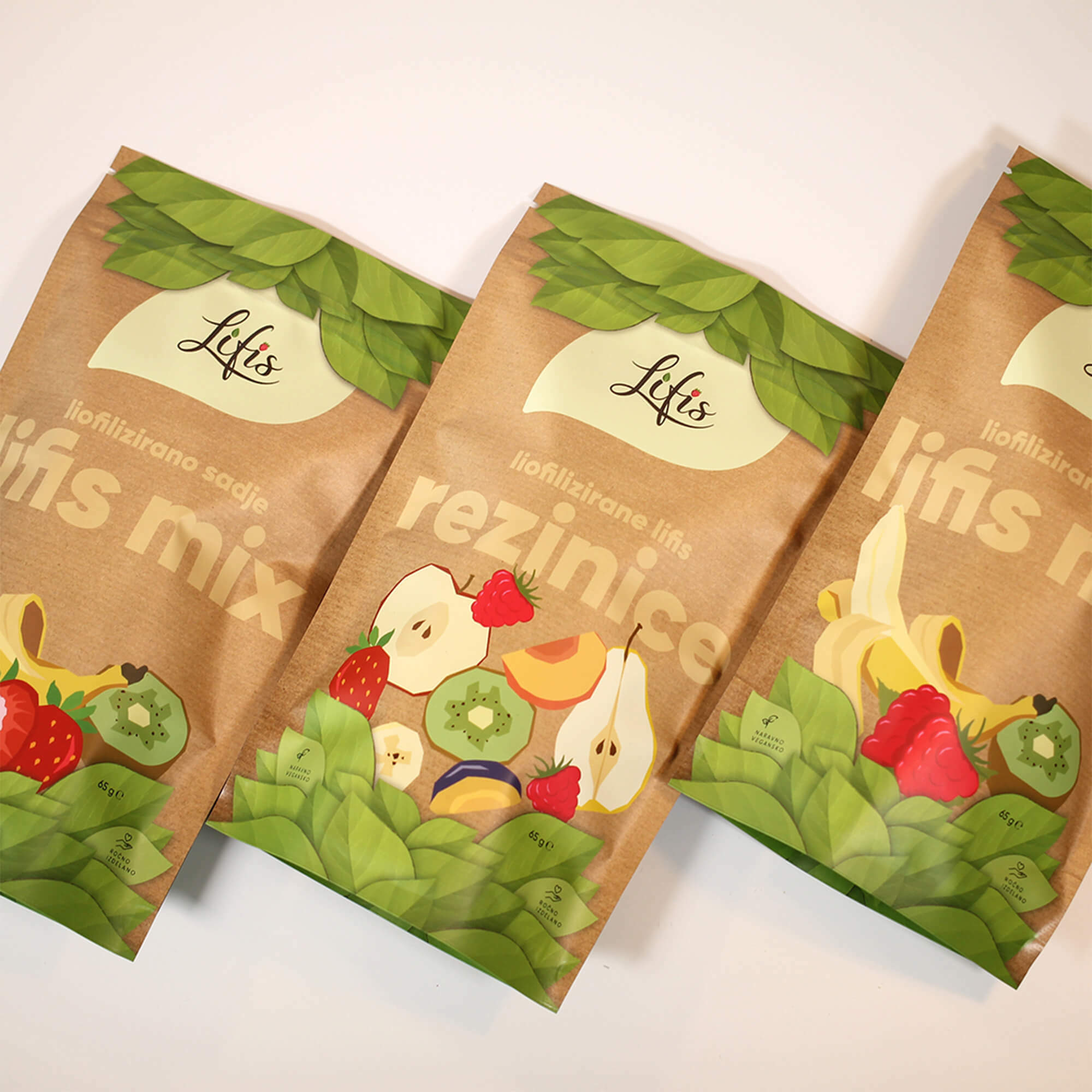 Za znamko Lifis sem oblikovala celostno vizualno identiteto – od logotipa do embalaže. Logotip se harmonično umešča med sodobne prehrambne blagovne znamke in izraža mehkobo, lahkotnost ter občutek povezanosti. Pri zasnovi embalaže sem sodelovala kot avtorica večine grafičnih elementov. Liofilizacija je sušenje z zamrzovanjem, pri čemer se okus in hranilna vrednost sadja in zelenjave ne spremenita.