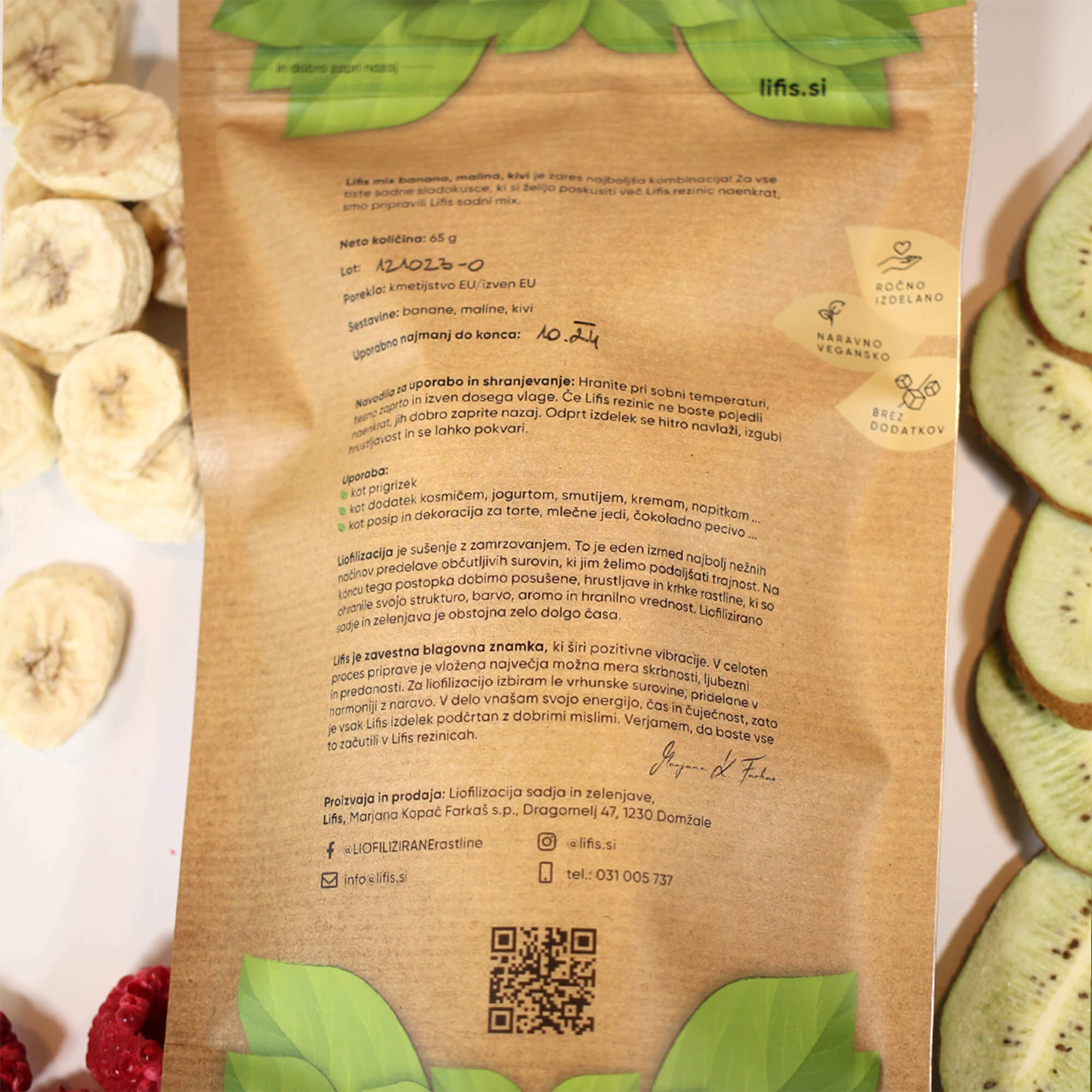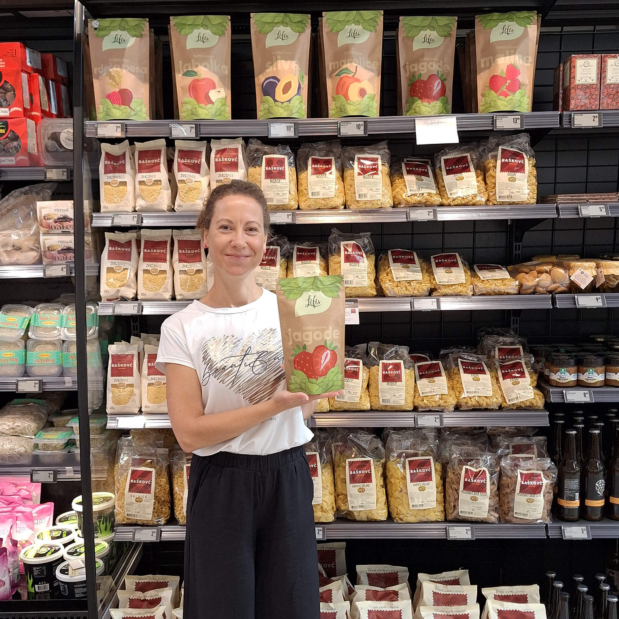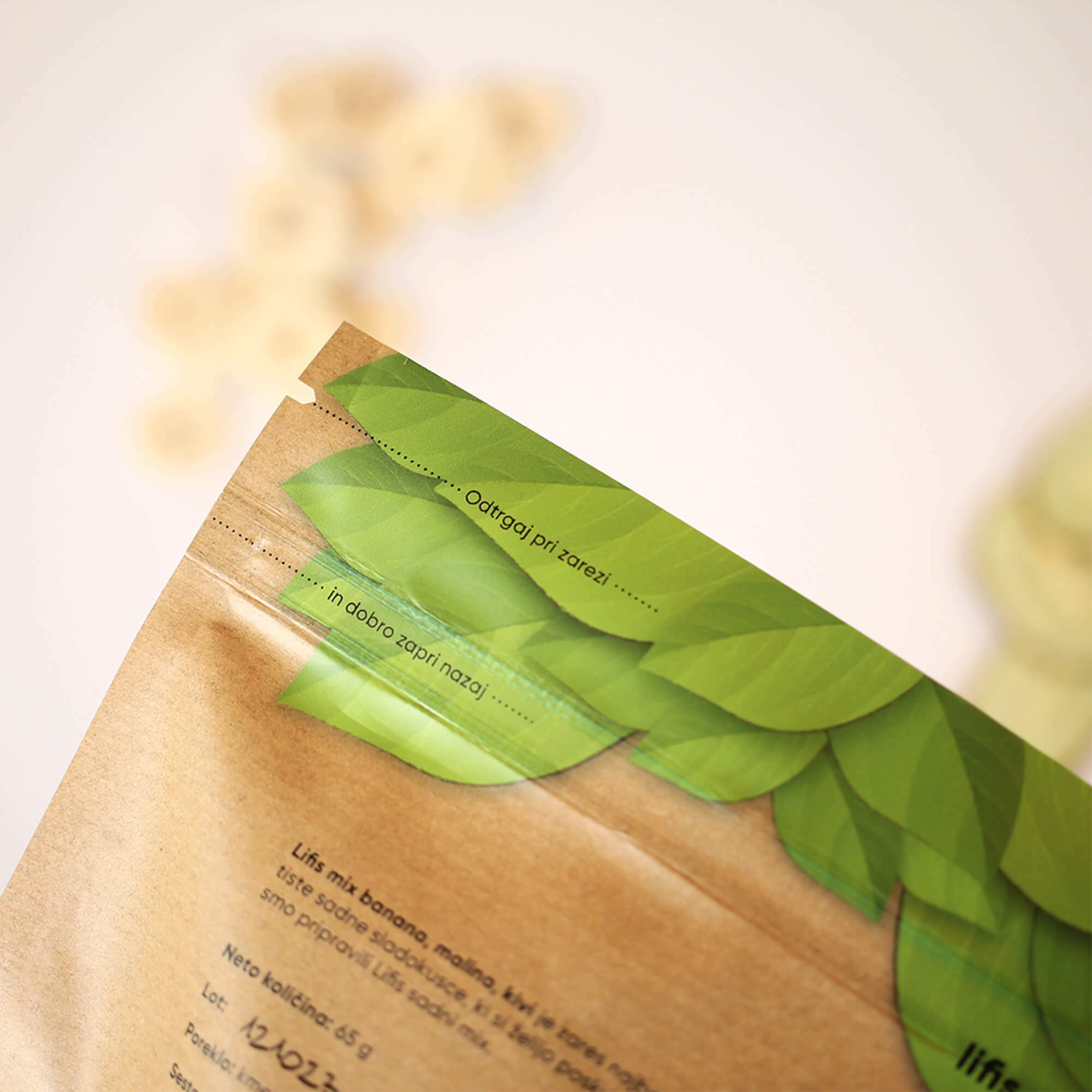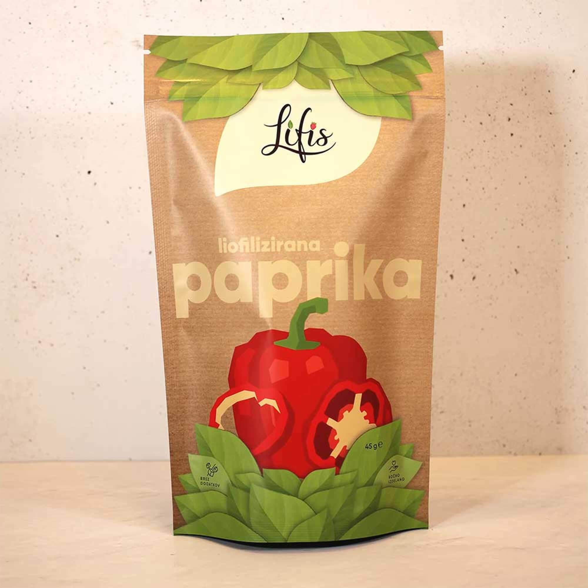 Za znamko Lifis sem oblikovala celostno vizualno identiteto – od logotipa do embalaže. Logotip se harmonično umešča med sodobne prehrambne blagovne znamke in izraža mehkobo, lahkotnost ter občutek povezanosti. Pri zasnovi embalaže sem sodelovala kot avtorica večine grafičnih elementov. Liofilizacija je sušenje z zamrzovanjem, pri čemer se okus in hranilna vrednost sadja in zelenjave ne spremenita.
