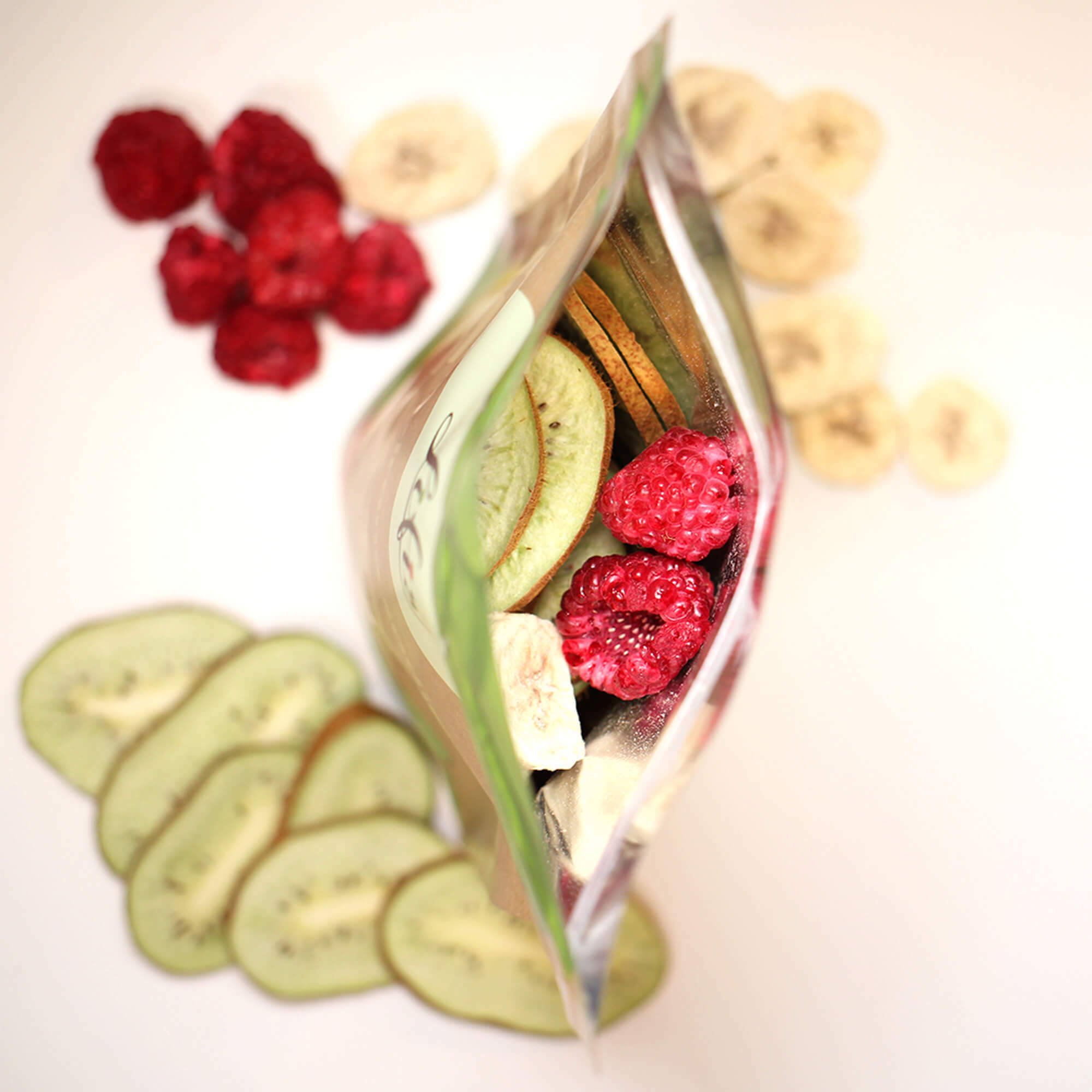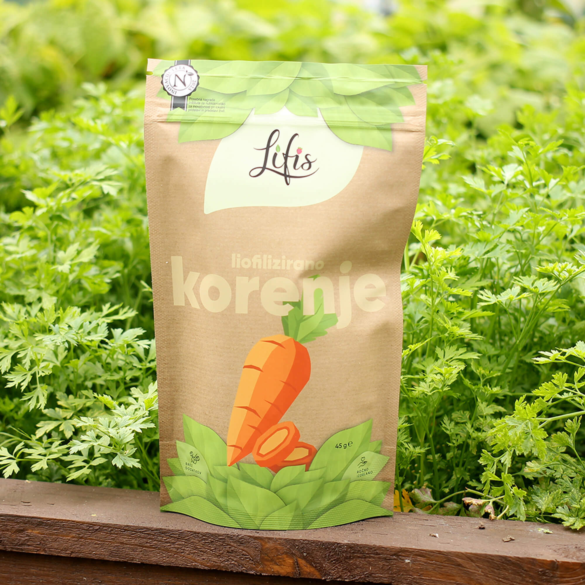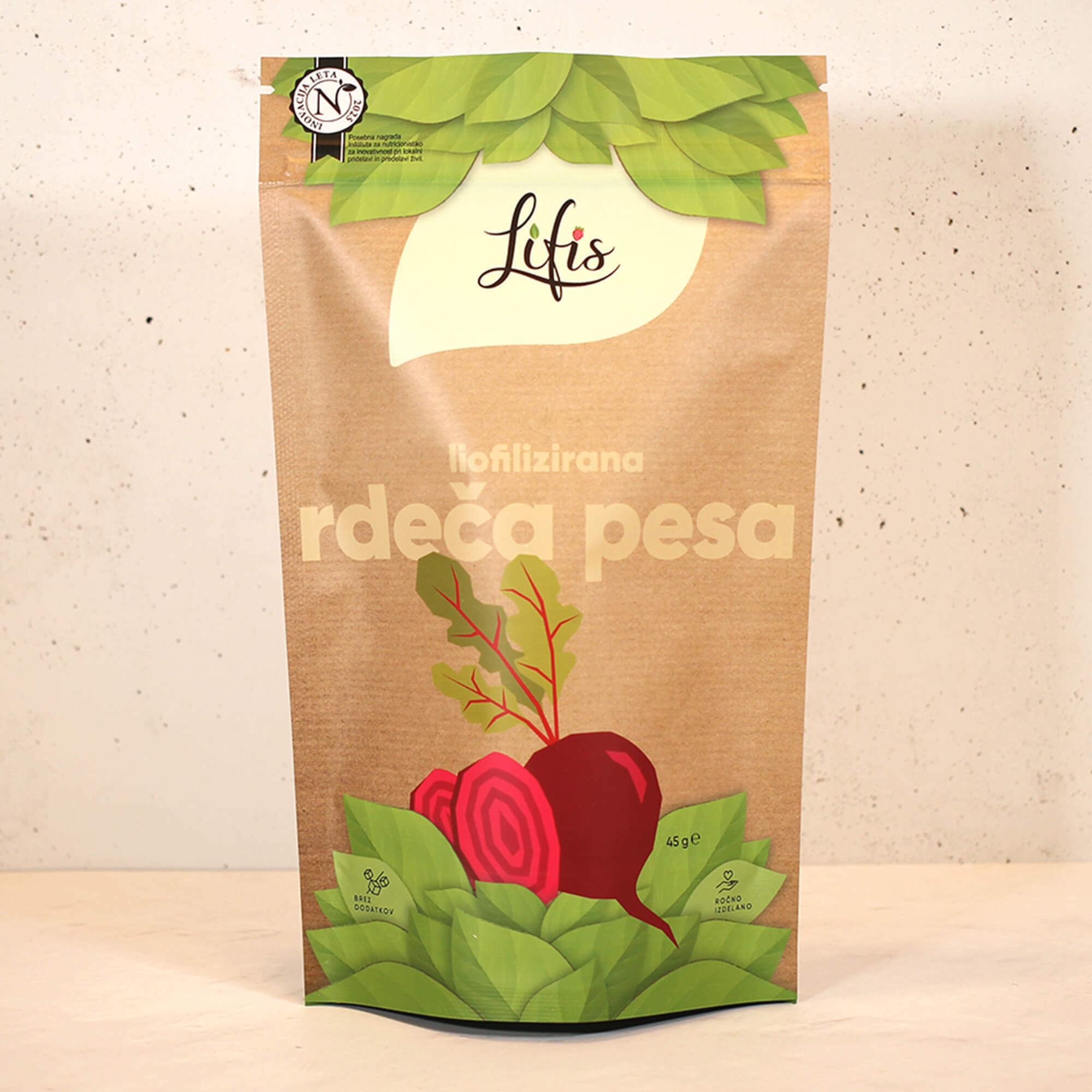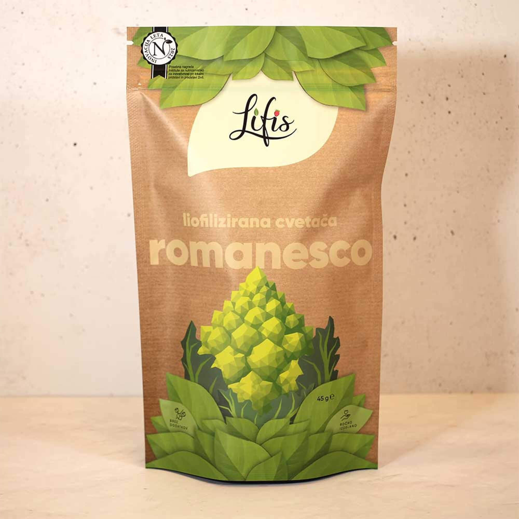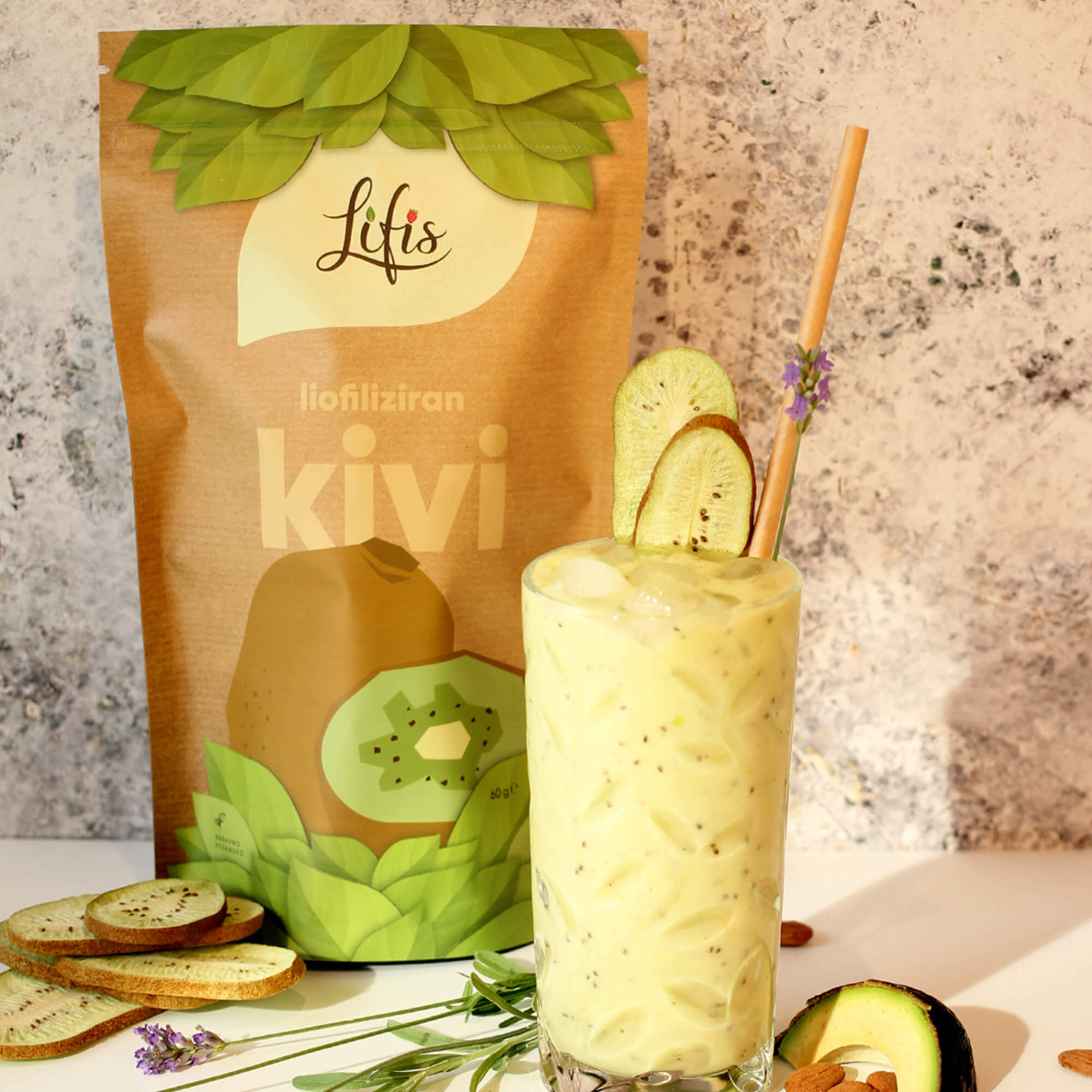 Za znamko Lifis sem oblikovala celostno vizualno identiteto – od logotipa do embalaže. Logotip se harmonično umešča med sodobne prehrambne blagovne znamke in izraža mehkobo, lahkotnost ter občutek povezanosti. Pri zasnovi embalaže sem sodelovala kot avtorica večine grafičnih elementov. Liofilizacija je sušenje z zamrzovanjem, pri čemer se okus in hranilna vrednost sadja in zelenjave ne spremenita.