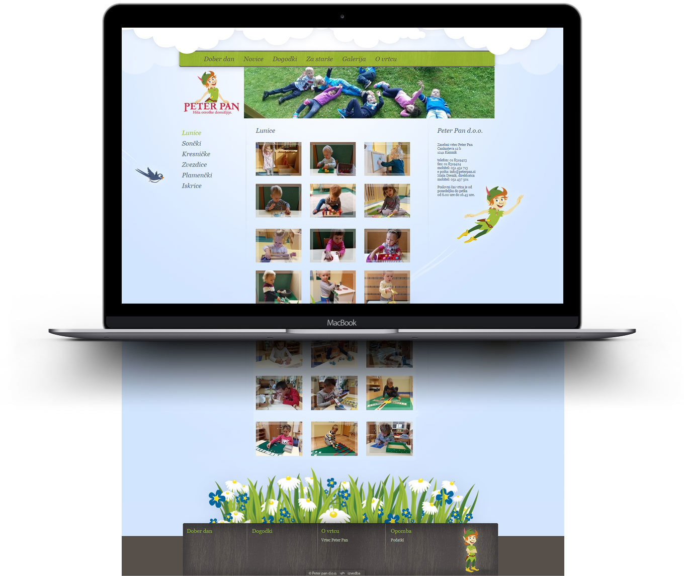 Za oblikovanje sem uporabila ilustracije, ki so bile unikatno izrisane za vrtec. Spletna stran lebdi v zraku, tako kot svet junaka Petra Pana. V tem stilu sem oblikovala tudi koledar in letni almanah. spletna stran vrtca Pete Pan