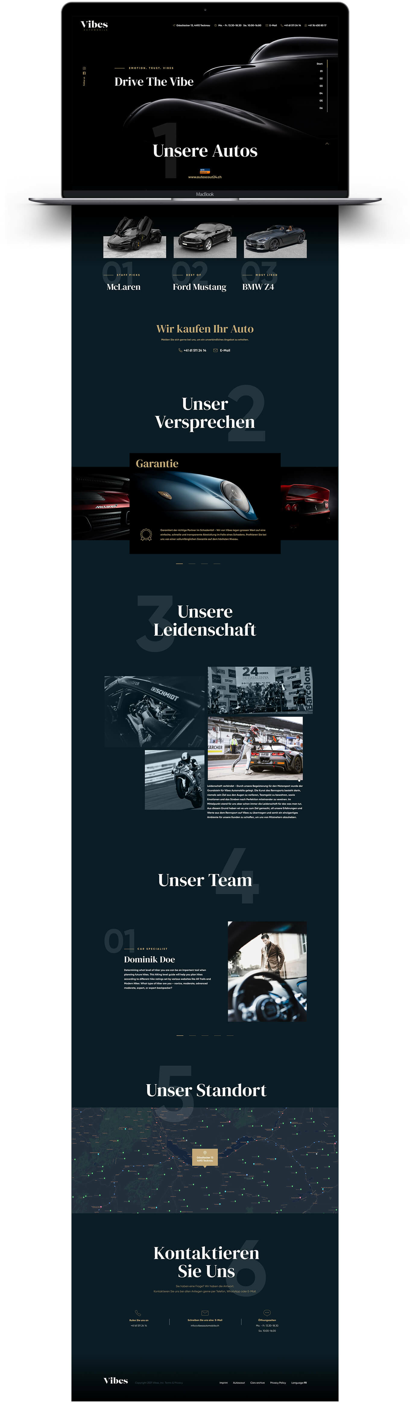 Vibes Automobile je prodajalec luksuznih rabljenih avtomobilov. Odločil sem se narediti identiteto, ki odraža ekstravaganco in nima tipičnih dizajnov avtomobilskih podjetij. Oblikovala sem logotip s celostno podobo, oprema prodajnih prostorov in spletno stran. Pripravila sem tudi art direkcijo fotografiranja avtomobilov za prodajno stran Autoscout24. Klik na Vibes fotografije je bil v trenutku 40 % višji, kot na ostale ponudnike.