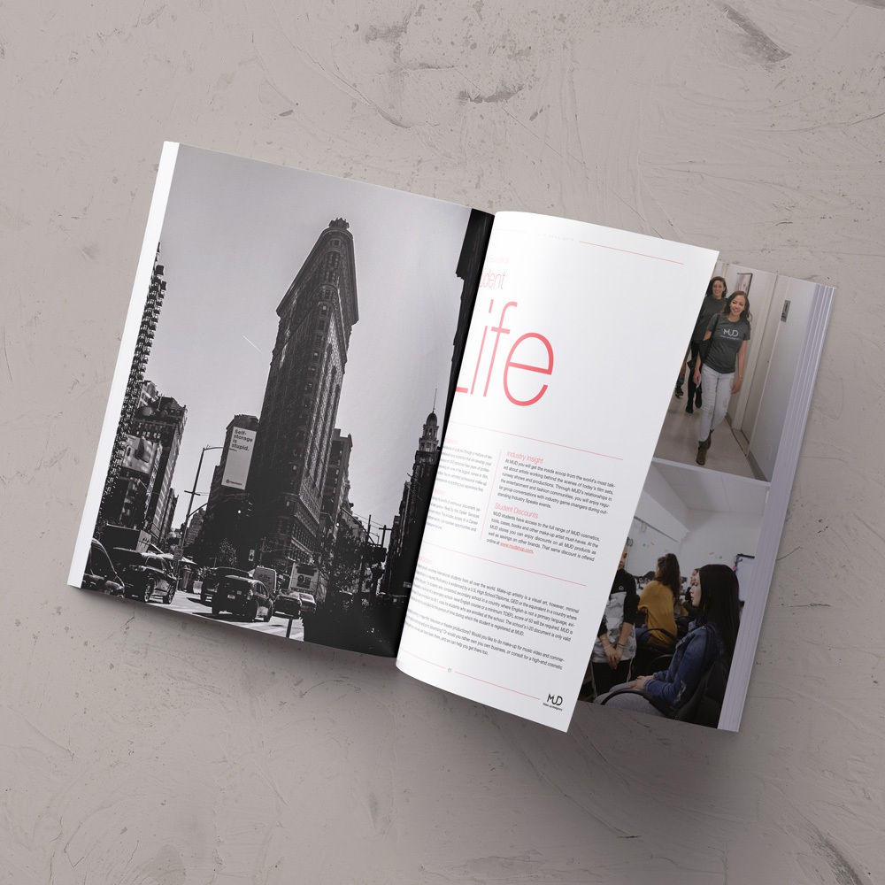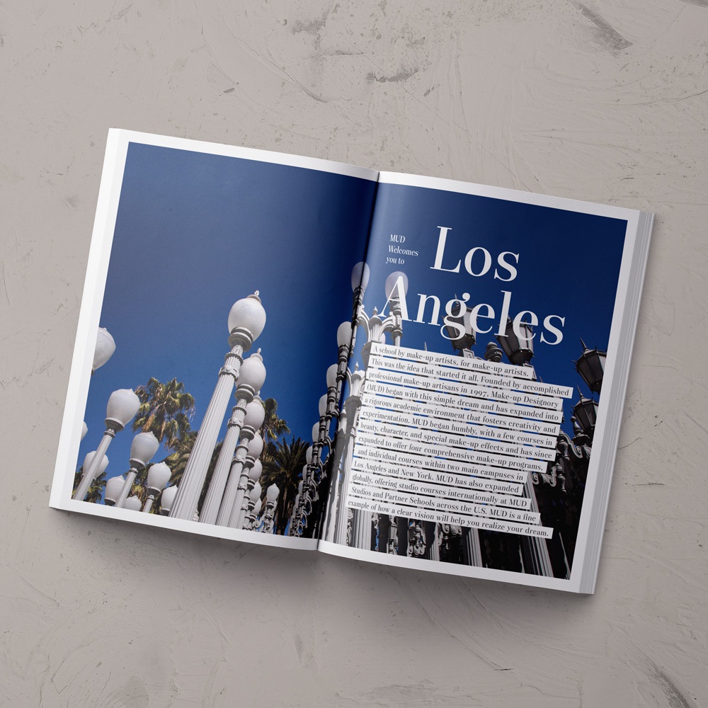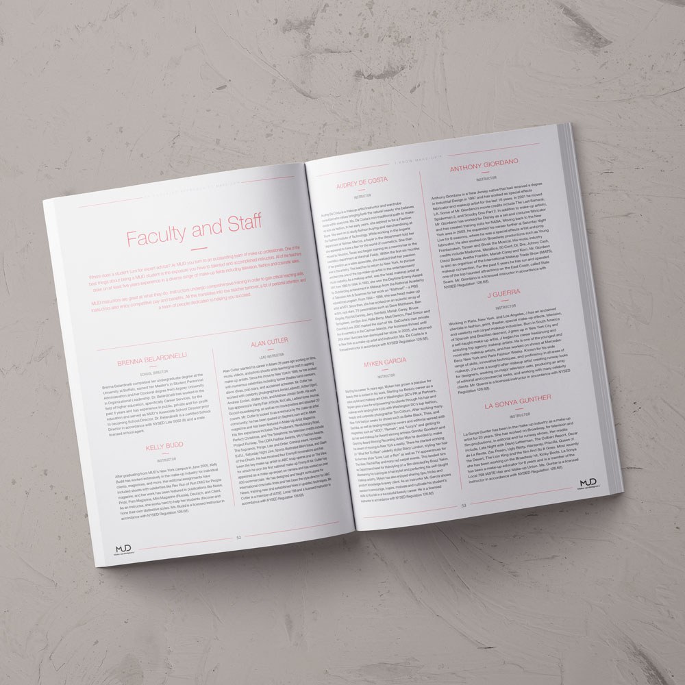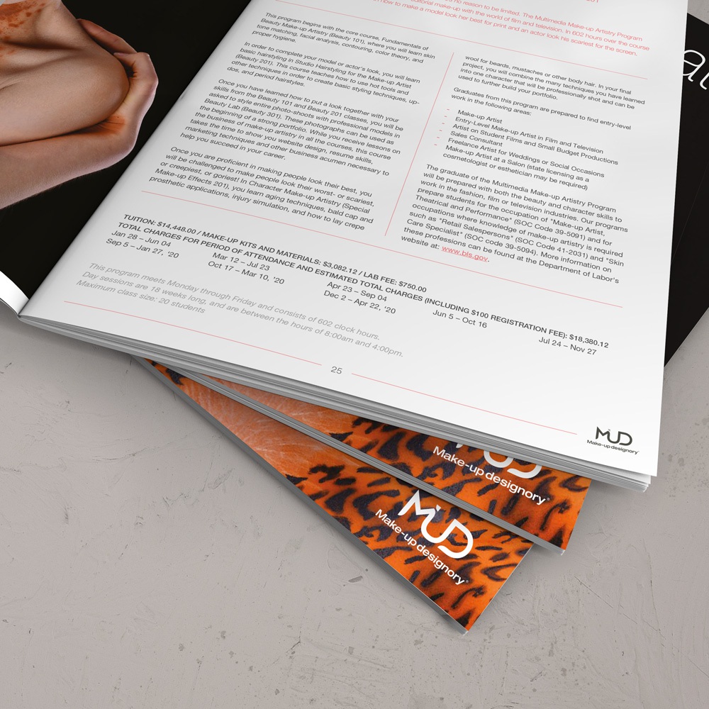 Naredila sem popoln redesign tega kataloga, ki zdaj v tej obliki izhaja vsako leto za Los Angeles in New York. Ker je ameriška šolska zakonodaja zelo striktna in se rada spreminja, smo zato vsako leto spremenili dobršen del kataloga. Njegov namen je, da potencialni študent dobi vse informacije, ki jih potrebuje v zvezi z vpisom in študijem. Fotografije v katalogu so zaključna šolska dela lokalnih študentov. https://issuu.com/makeupdesignory/docs/mud_nyschoolcat_2018_final_web
