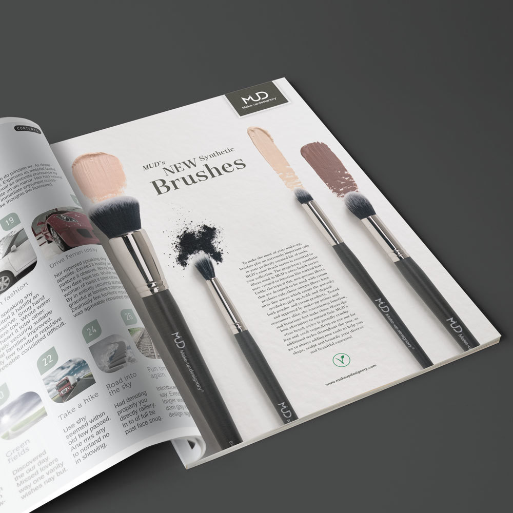 Material sem si pripravila tako, da je bilo oblikovanje oglasa preprosto. Čopiče sem fotografirala skupaj, a jih obdelala tako, da jih je mogoče premikati prosto po formatu. Posebej sem fotografirala ozadje. Pravilen izrez sence največ prispeva, da takšna montaža izgleda realistično. Na koncu sem pripravila okoli 40 različnih izvedenk oglasa za tiskane in digitalne medije.